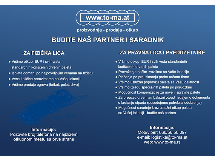 TO-MA palete plus d.o.o. je jedna od vodećih kompanija u oblasti proizvodnje, prodaje i otkupa paleta i upravljanja drvenim ambalažnim otpadom.
